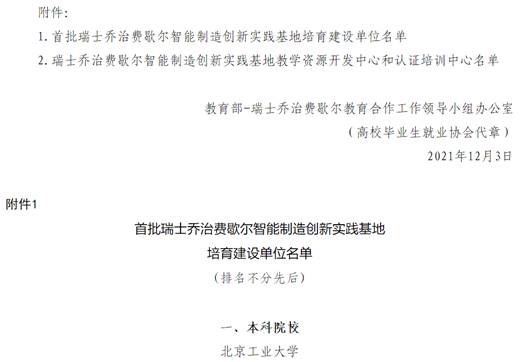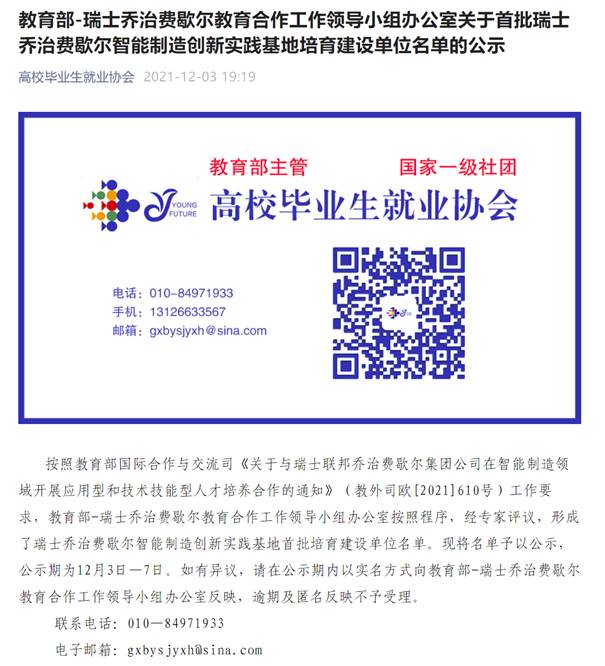 关于首批瑞士乔治费歇尔智能制造创新实践基地培育建设单位名单的公示