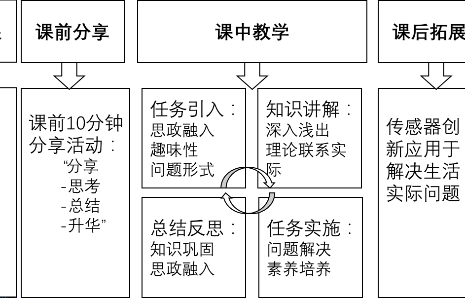 针对传感器课程的知识架构及教学目标,结合高职学生的认知规律和学习特点,并在多次摸索实践的基础上总结经验反思不足,传感器课题组初步确立了“传感器+思政课程”教学模式。将“传感器+思政课程”教学模式分为三个环节:课前环节实施课前10分钟知识分享活动,通过学生分享抛出热点或问题,引发同学们思考,老师精准定位总结提升,找准时机将思政落地;课中教学环节以任务引入、知识讲解、任务实施和总结反思展开,任务引入环节创设问题情境,增加生活性和趣味性,适时引入问题蕴含的思政元素,激发学生的学习兴趣和学习主动性;知识讲解环节力求原理分析通俗易懂、深入浅出,理论联系实际,使学生明确理论知识与实际应用联系,提高学生对知识学习的价值认同;任务实施环节将传感器相关知识和实践实验有机结合,注重隐形思政元素的渗透,培养学生的实际应用能力和认真细致、实事求是、积极探索的科学态度和工作作风;总结反思环节注重对知识的巩固、提炼和升华,使学生能够举一反三、学以致用。课后拓展环节引导学生将传感器创新应用与实际问题的解决,在将创新思路转化为创新产品的过程中,不仅提高学生的创新能力,也培养学生坚忍不拔的意志品质。