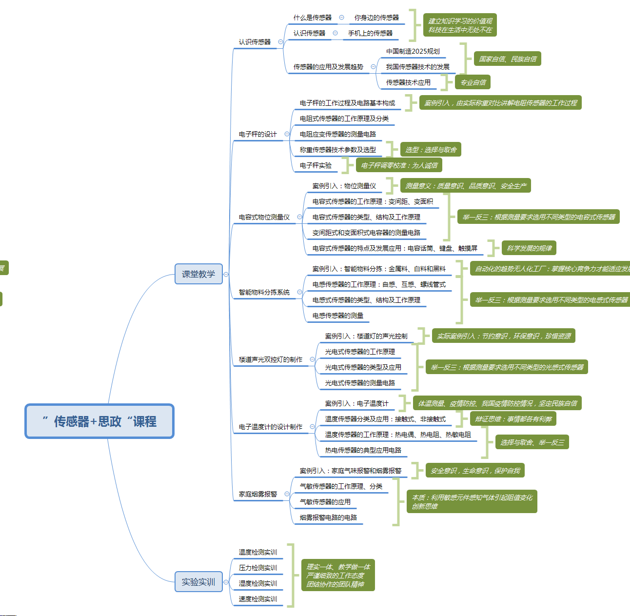 如何巧妙的在传感器课程中融入思政元素,传感器课程组的教师们在传感器课程设计巧花心思、下深功夫。对传感器课程自身而言,其内容涵盖温度、力、位移、速度、液位、气体、湿度、噪声及生物量等参数的检测,涉及各类传感器的结构、性能和原理,是集合电学、光学、力学、机械等多门学科知识的综合学科。由于课程知识杂且覆盖面广、内容分散缺乏连续性,传统的教学方式难以取得理想效果。所以课题组教师在教学设计的过程中,将典型功能的传感器融入到典型的案例中,如生活中的电子秤、智能物料分拣系统、家庭烟雾报警等,在加强理论知识与生活实际的联系,将趣味性、生动性和饱含话题的实例引入课堂,激发学生热烈讨论和思考,引导学生充分感悟其中蕴含的思想、道德元素,实现专业知识的内化和思想品质的升华。