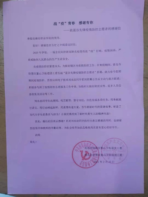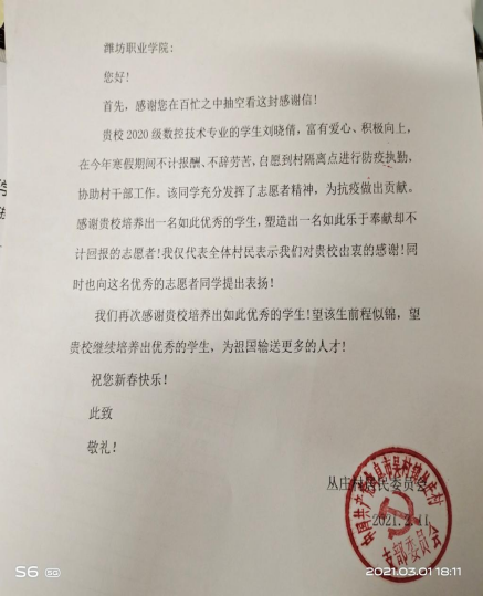 来信对我院2020级数控技术专业刘晓倩同学和应用电子技术专业刘永喆同学积极参与疫情防控志愿服务工作给予高度赞扬,对学校为社会培养出如此优秀且乐于奉献的好学生致以衷心的感谢。在疫情防控的紧要关头,两位同学协助村庄开展疫情防控知识宣传,返乡人员信息收集及回访等工作,热心服务居民生活,充分发挥了志愿者精神,为抗击疫情做出贡献。