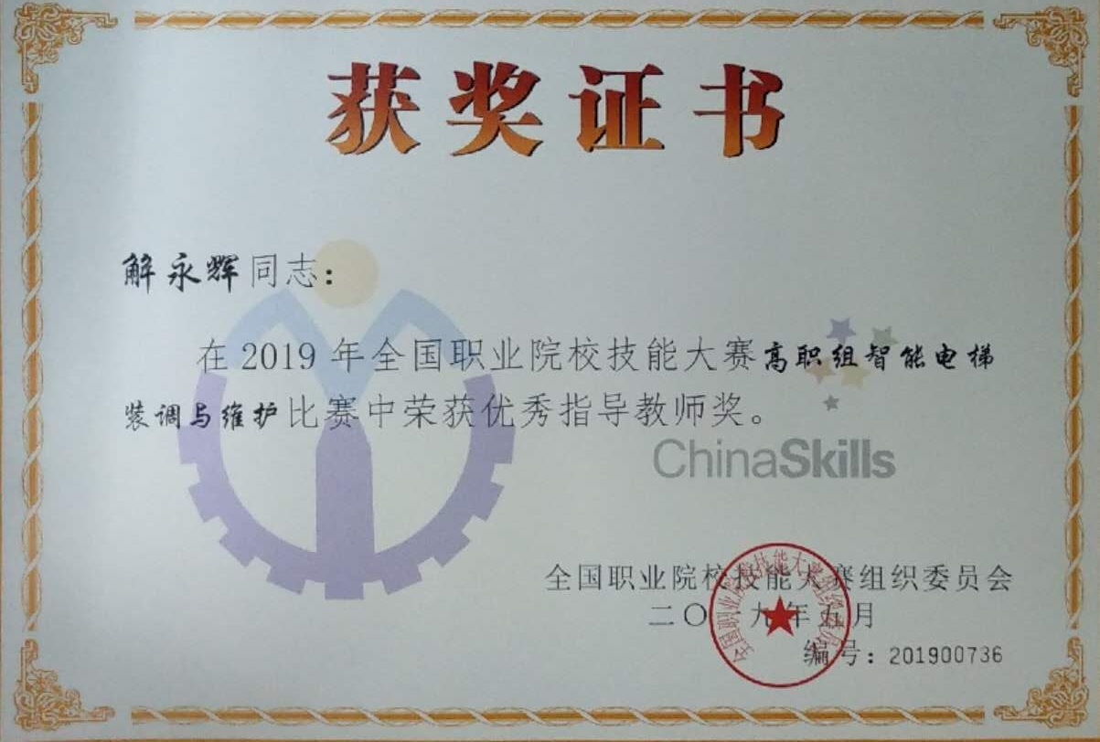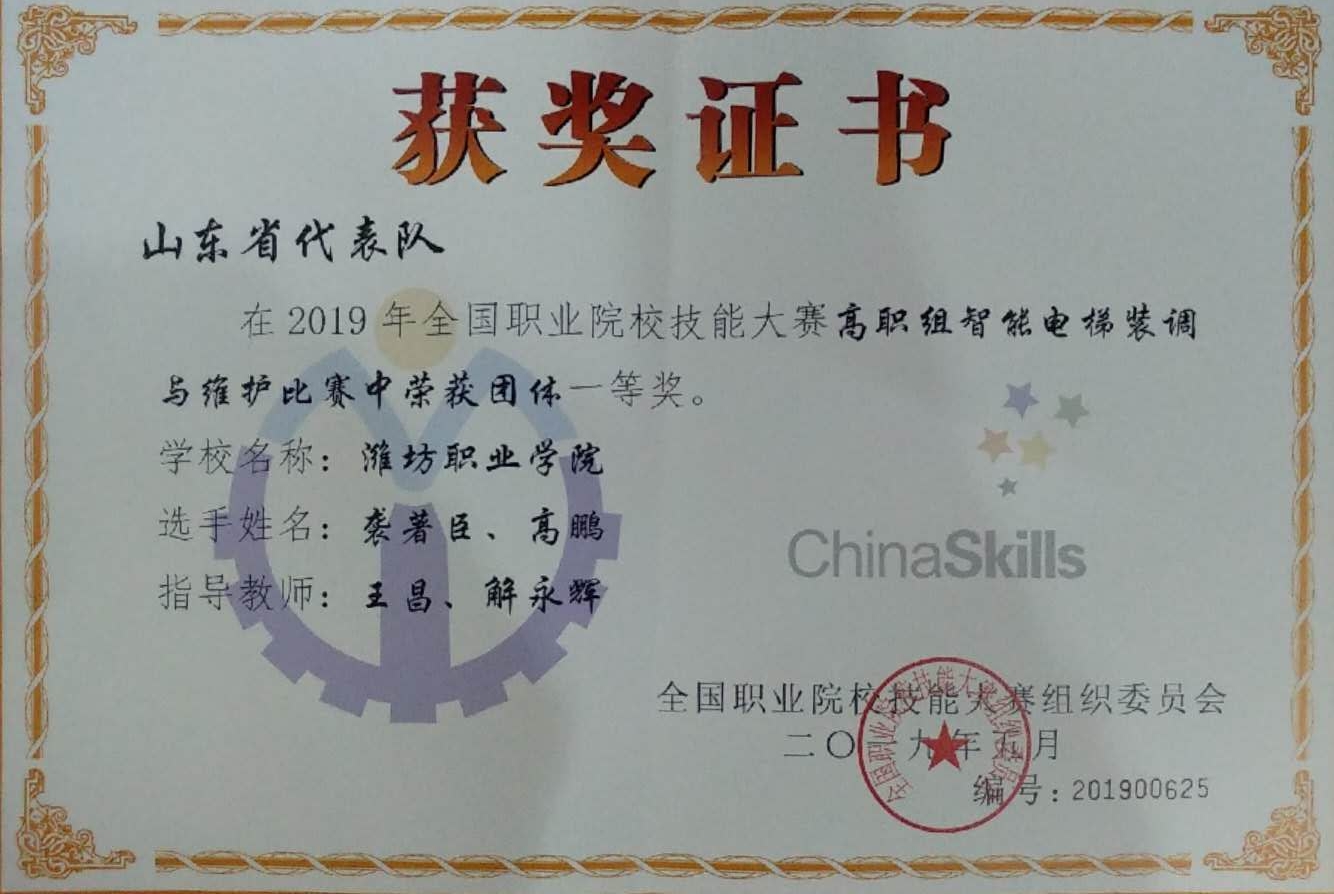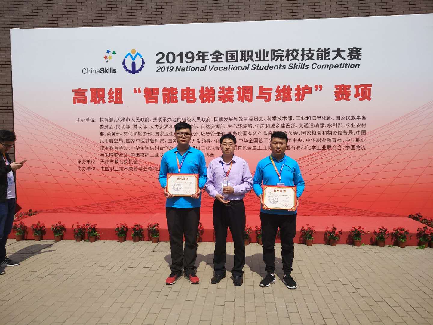 5月6日至8日,2019年全国职业院校技能大赛高职组“智能电梯装调与维护”赛项在天津轻工职业技术学院举行,来自全国的90支代表队参赛。77779193永利集团选派2017级电梯工程技术班学生袭著臣、高鹏,指导教师王昌、程义民、解永辉组成的山东三队参加比赛并获得团体一等奖,这是我院连续五届获得该赛项国赛一等奖。