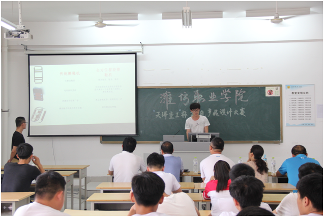 此次比赛的主题是“绿色、共享、开放、创新,共建美丽新时代”,围绕主题共有23个参赛作品。有创意概念的“下水道疏通机器人”、“水陆两栖车”项目;有解决日常生活问题的“全方位智能擦鞋机”、“阳台多肉智能花架”项目;有解决农业生产问题的“粮食自动装袋称重机”、“新型韭菜收割机”项目;还有已经应用于生产中的“全封闭双刀刮墨系统”项目等。比赛过程中,参赛团队准备充分、自信从容、思路新颖,借助三维创意图、视频和实物向大家展示作品,得到了评委老师和同学们的一致肯定和掌声。评委老师从创新性、实用性、专业性等角度考察项目,中肯的的点评和精准的点拨,使学生受益匪浅。