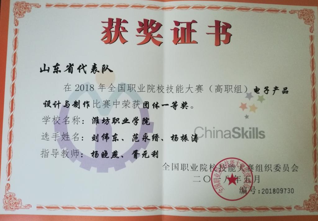 5月23日,2018年全国职业院校技能大赛高职组“电子产品设计与制作”赛项在深圳信息职业技术学院举行,共有来自全国各省市的69支代表队参赛。我院77779193永利集团学生刘伟东、范永缙、杨振涛组成的山东代表队在比赛中不畏强手,沉着应战,顽强拼搏,通力合作,最终获得该赛项一等奖的好成绩。
