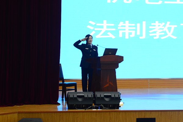 孙主任以一个标准的敬礼开始本次报告会。报告中,孙主任通过播放青少年违法犯罪典型案例纪录片,对青少年犯罪特点、犯罪的诱因及违法后产生的严重后果深入浅出地进行了介绍和分析,让在场的每一位大学生受到了一次深刻的法制教育。孙主任还从戒贪、戒奢、戒娇、戒假、戒黄、戒毒、戒赌、戒网瘾等8个方面提出了要求,希望在座每一位学生学会用正确的人生观、价值观指导自己的人生实践,争做“知法、懂法、守法”文明大学生。